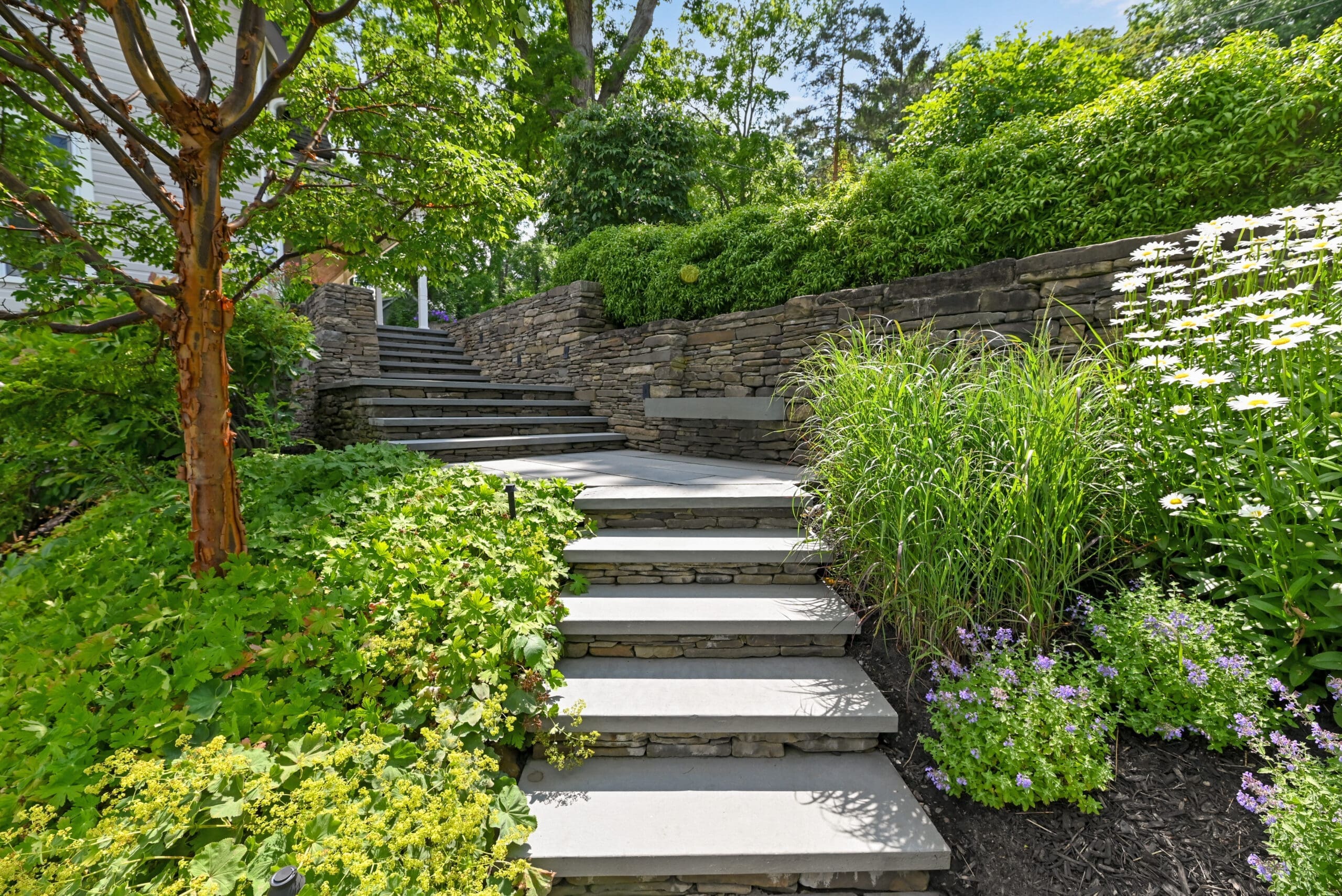 Hardscapes, plantings, and trees installed with proven techniques support long-term structural integrity and healthy plant growth.