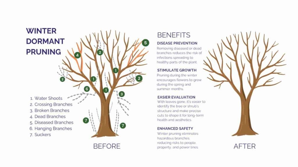 - Winter pruning eliminates hazardous branches that could break under the weight of snow or ice, reducing risks to people, property, and power lines.