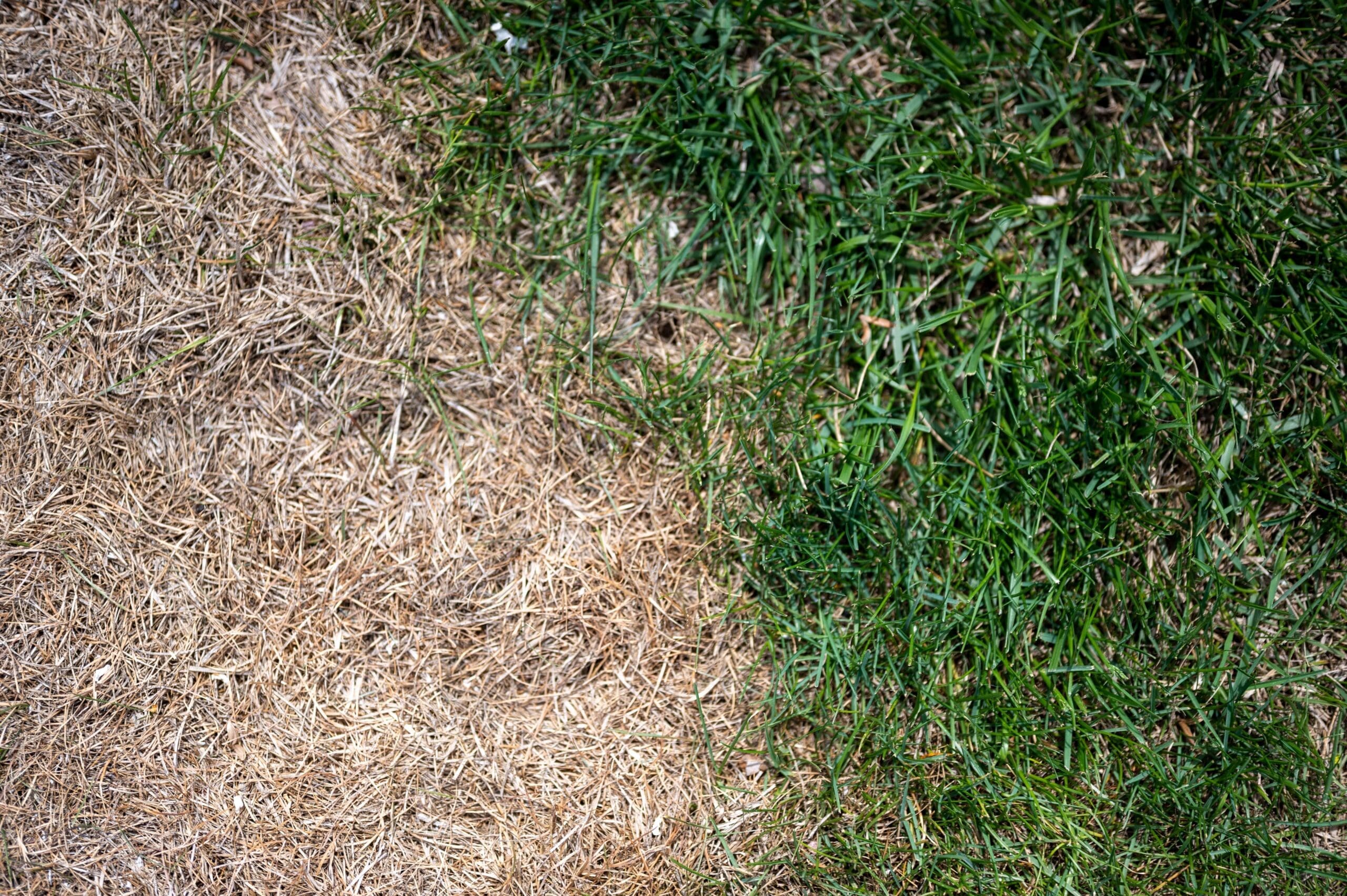 A lawn with green grass patches and large brown, dry areas, indicating heat stress from summer temperatures.